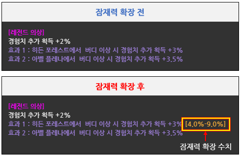 - 잠재력은 레전드 옵션의 경험치 추가 획득 수치가 등장할 수 있는 최소치와 최대치로 구성되어 있으나,