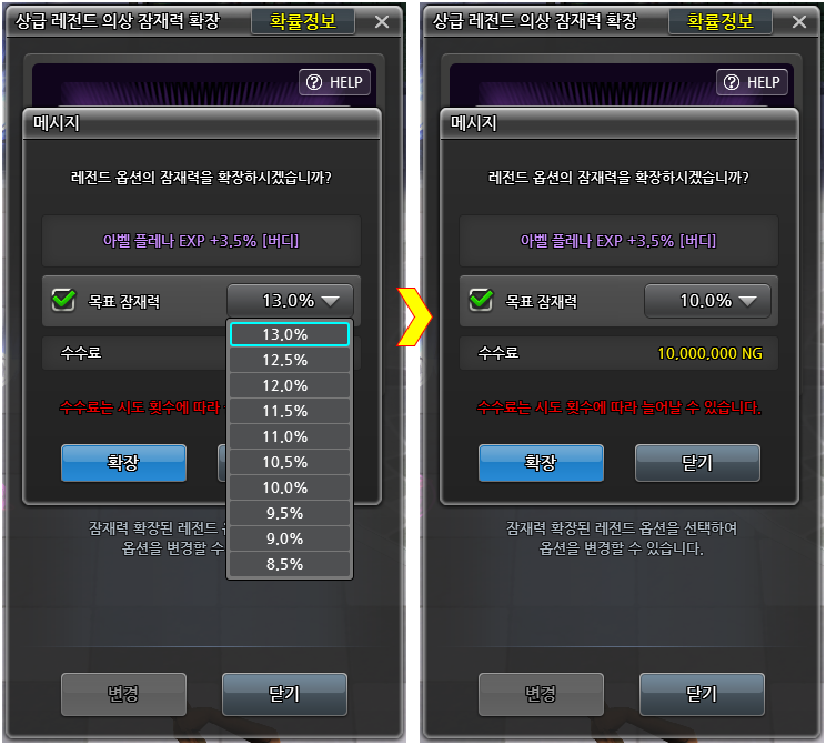 - 잠재력 확장 시 바로 경험치 수치가 반영되는 것은 아니며, 옵션 변경을 진행해야 경험치 수치가 확률에 따라 등장합니다.