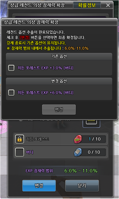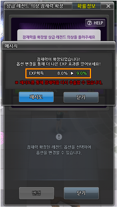 잠재력 확장 후 옵션 변경을 통해 잠재력 상한선까지의 경험치 수치가 확률에 따라 등장하게 됩니다.
