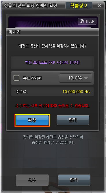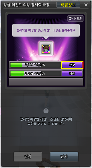 잠재력이 확장된 옵션은 상급 레전드 의상 잠재력 확장 메뉴에서만 변경할 수 있으며,