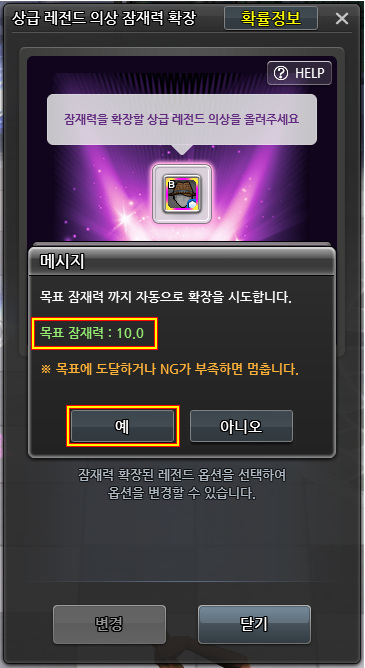 ② 설정한 목표 잠재력이 맞는지 확인 후, [예] 버튼을 클릭하면 원하는 잠재력 수치까지 잠재력 확장이 반복됩니다.