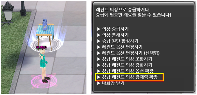 ① NPC 프리카 상단에 위치한 재봉틀을 클릭하고 [상급 레전드 의상 잠재력 확장] 메뉴를 클릭합니다.