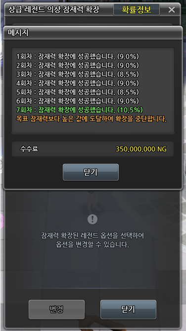 - 수수료는 선택한 옵션의 잠재력 확장 시도 횟수에 따라 증가하며, 다른 캐릭터로 의상을 옮기거나 거래하여도 횟수는 유지됩니다.