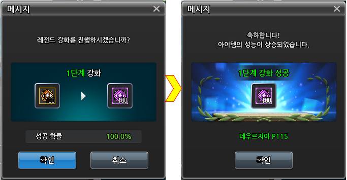 ② 최종 확인 팝업에서 확인 버튼을 클릭하면 강화가 완료됩니다.